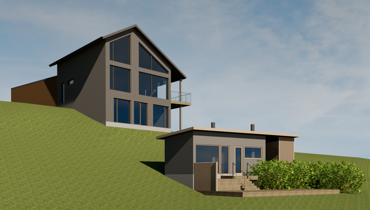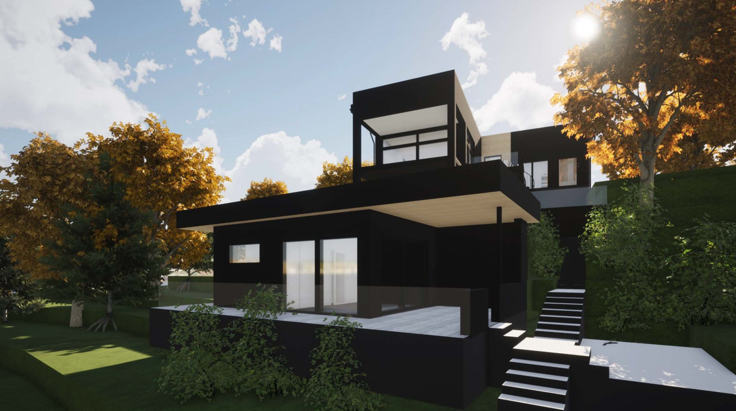 Harjakattoisessa betonielementtitalossa hyödynnetään maksimaalisesti upea merimaisema. Harjakaton alle on rakennettu kekseliäästi lasten huoneet. Olohuoneen takka on rakennettu paikan päällä ja se nousee viiden metrin korkeuteen asti.