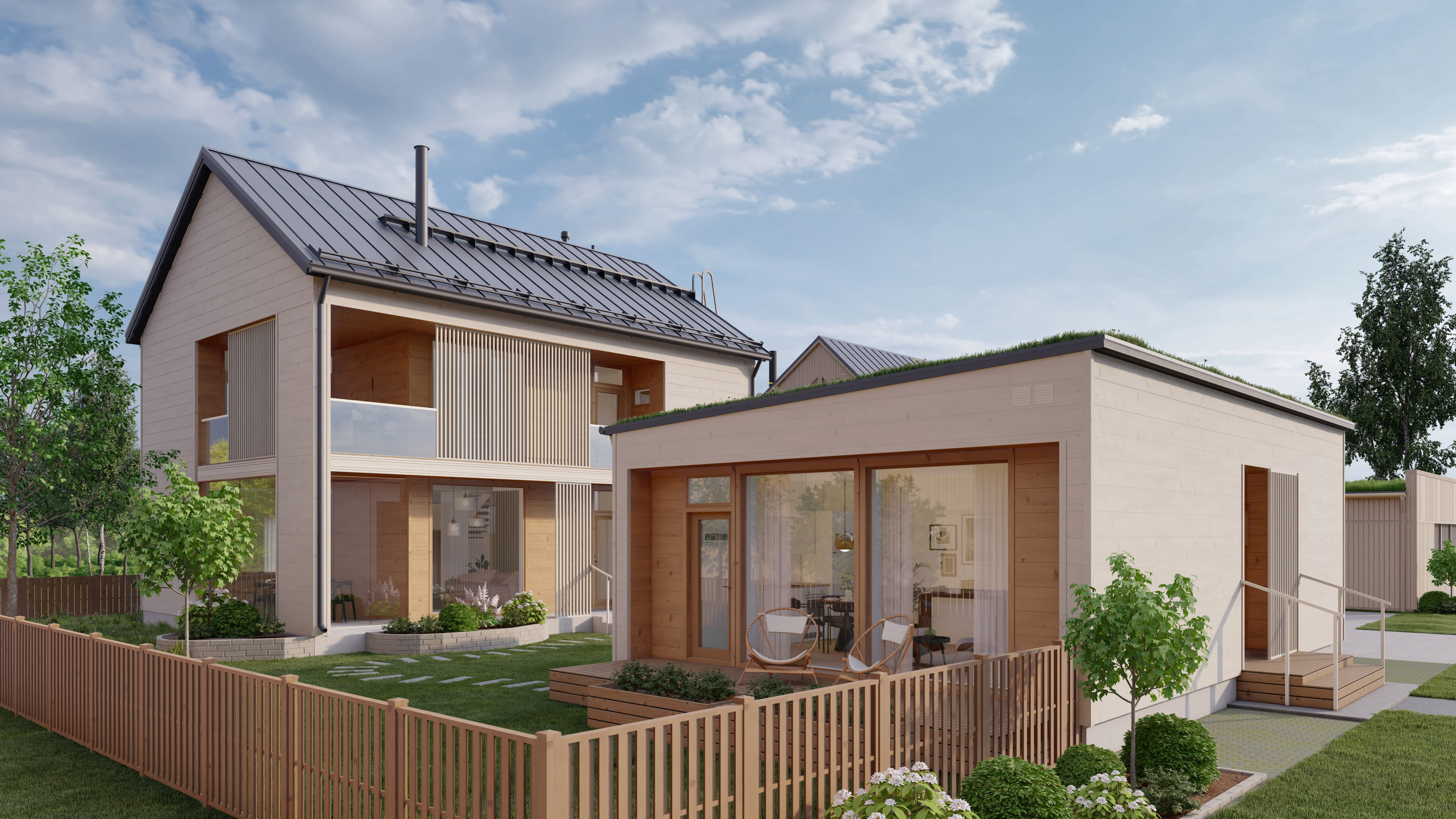 Päärakennuksen asuinneliöiden rinnalla toimii piharakennus, “ateljee”, jossa on puusauna, työtilaa ja oma sisäänkäynti. Näin koti jakautuu selkeästi rauhoittumisen sekä työn ja arjen tarpeisiin. Sisätilat ovat tulevan asukkaan käsialaa: vaaleaa koivua, rimoituksia, harkittua valaistusta, apuina automaatiojärjestelmä yhdistettynä valonohjaukseen.
