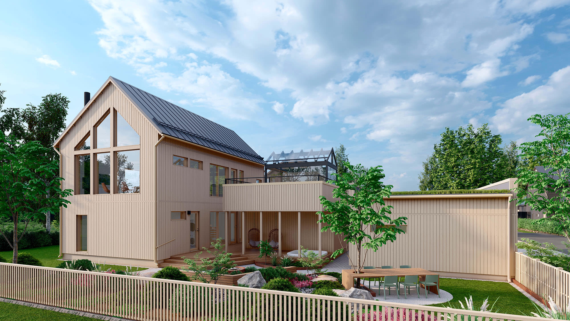Kaksikerroksinen pienen perheen hirsikoti, jossa yhdistyvät terveellinen sisäilma, teknologia ja luonnonläheisyys. Esteetön alakerta, älyvalaistus ja ekologiset materiaalit tekevät kodista toimivan ja aikaa kestävän. Lasitettu terassi, jäkäläkasvikatto ja älylasiseinät ilmentävät perheystävällistä ajattelua, jossa arki, kauneus ja kestävyys elävät sopusoinnussa.