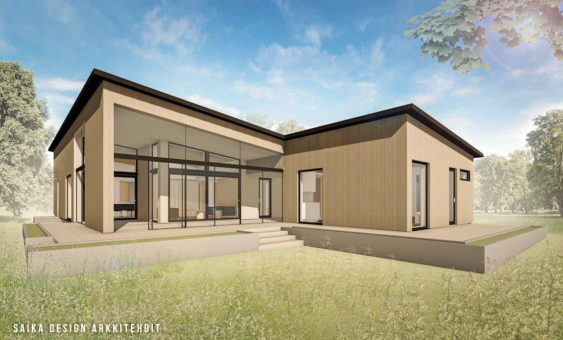 Yksikerroksinen puutalo lehdon laidalla on suunniteltu monilapsisen perheen rauhaan ja rytmiin. Talo jakautuu selkeästi vanhempien ja lasten tiloihin, joita yhdistävät avara olohuone ja lasitettu terassi.