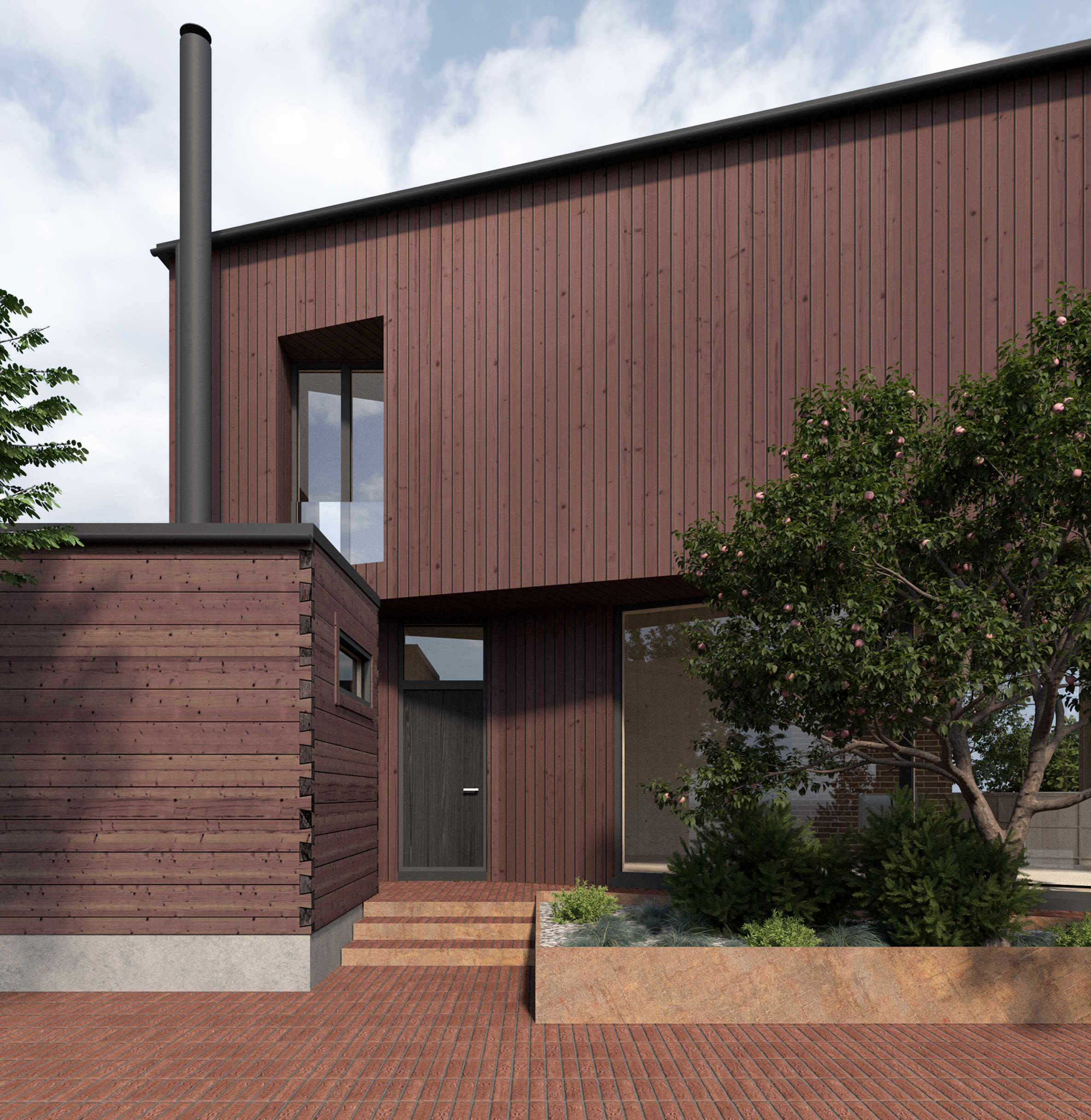 Kaksi eriväristä CLT-taloa, yksi jaettu elämäntapa. Veistoksellinen arkkitehtuuri, yhteinen kesäkeittiö ja puoliyksityinen puutarha yhdistävät perheet. Rakennusmateriaalina käytetty massiivipuu hengittää pohjoista estetiikkaa.