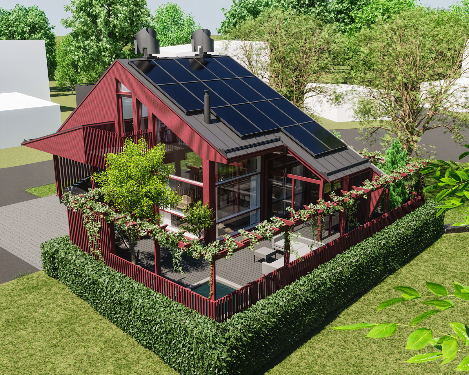 Kodit on rakennettu yhdessä ja osin yhdessä elettäväksi: kesäkeittiö, vehreä ”ihastele, tuoksuttele, maista” -puutarha ja yhteinen terassi muodostavat puoliyksityisen kohtaamisen tilan. Hietasaaren Veisto näyttää, kuinka kahden perheen yhteisestä visiosta voi syntyä yksi yhtenäinen, veistoksellinen ja vastuullinen kotikokonaisuus.